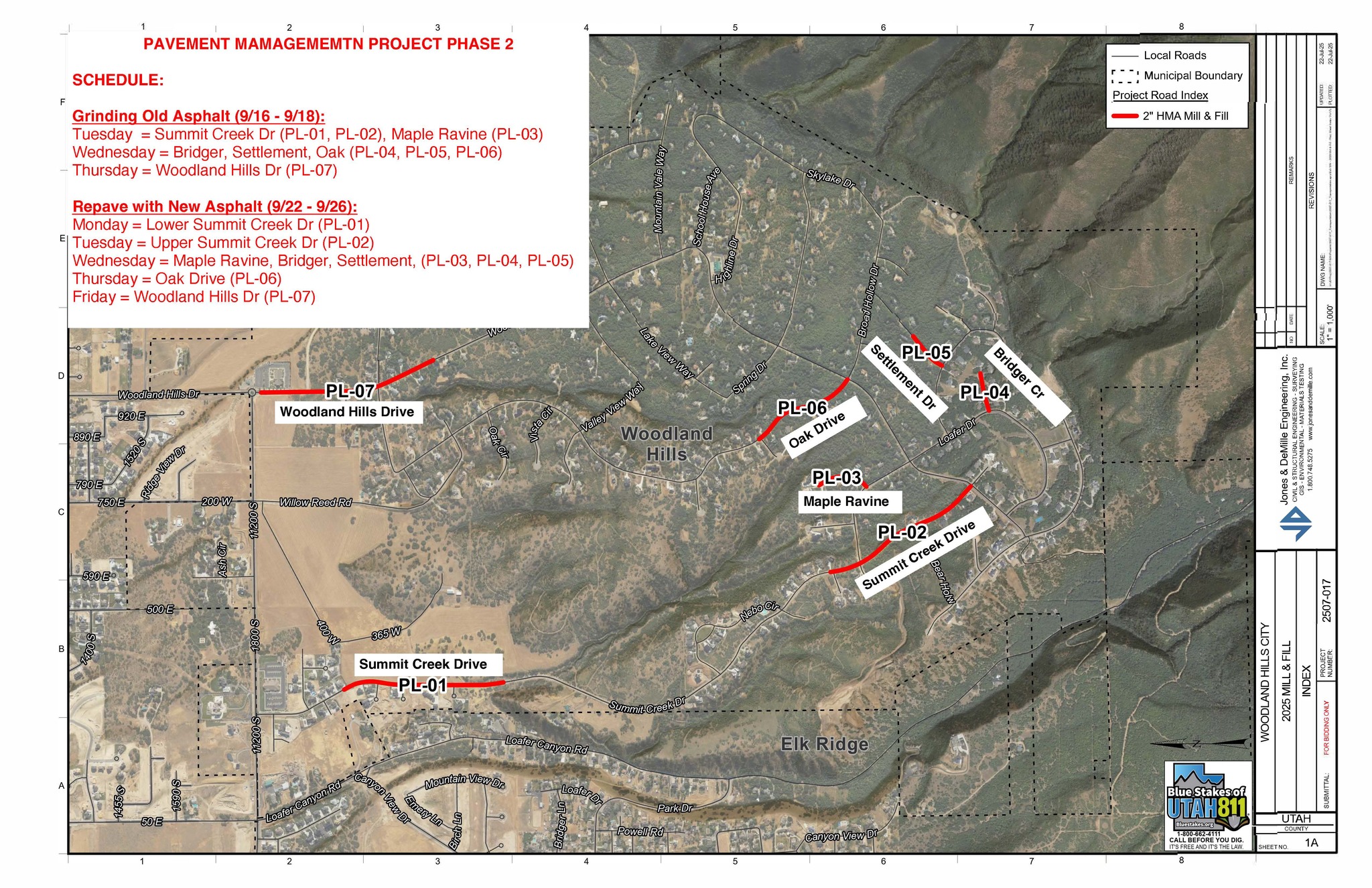Phase 2 is a two-part project. Tuesday 9/16 through Thursday 9/18, the crews will be grinding off two inches of the existing asphalt on the roads. The week of 9/22 through 9/26, the crews will be placing two inches of new asphalt. Traffic will be permitted to drive on the roads between grinding and paving.